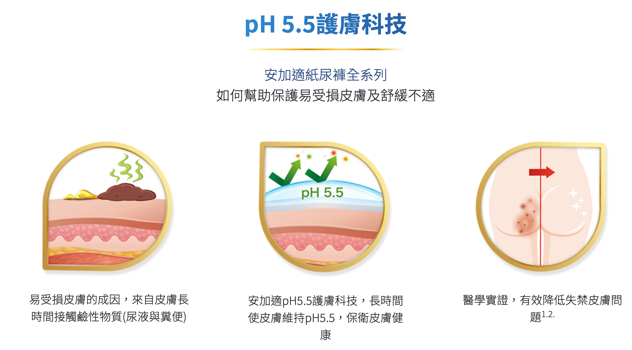 一般護理產品為身體其他部位設計,往往有 酸鹼度較高的清潔劑(detergent)成份會洗去失禁敏感部位的pH 5.5 天然保護膜,令皮膚變得脆弱乾燥容易刺激。