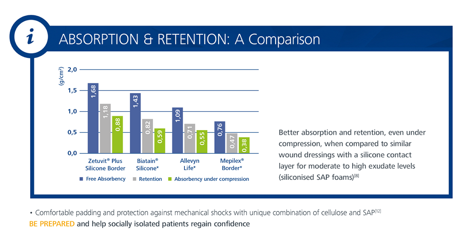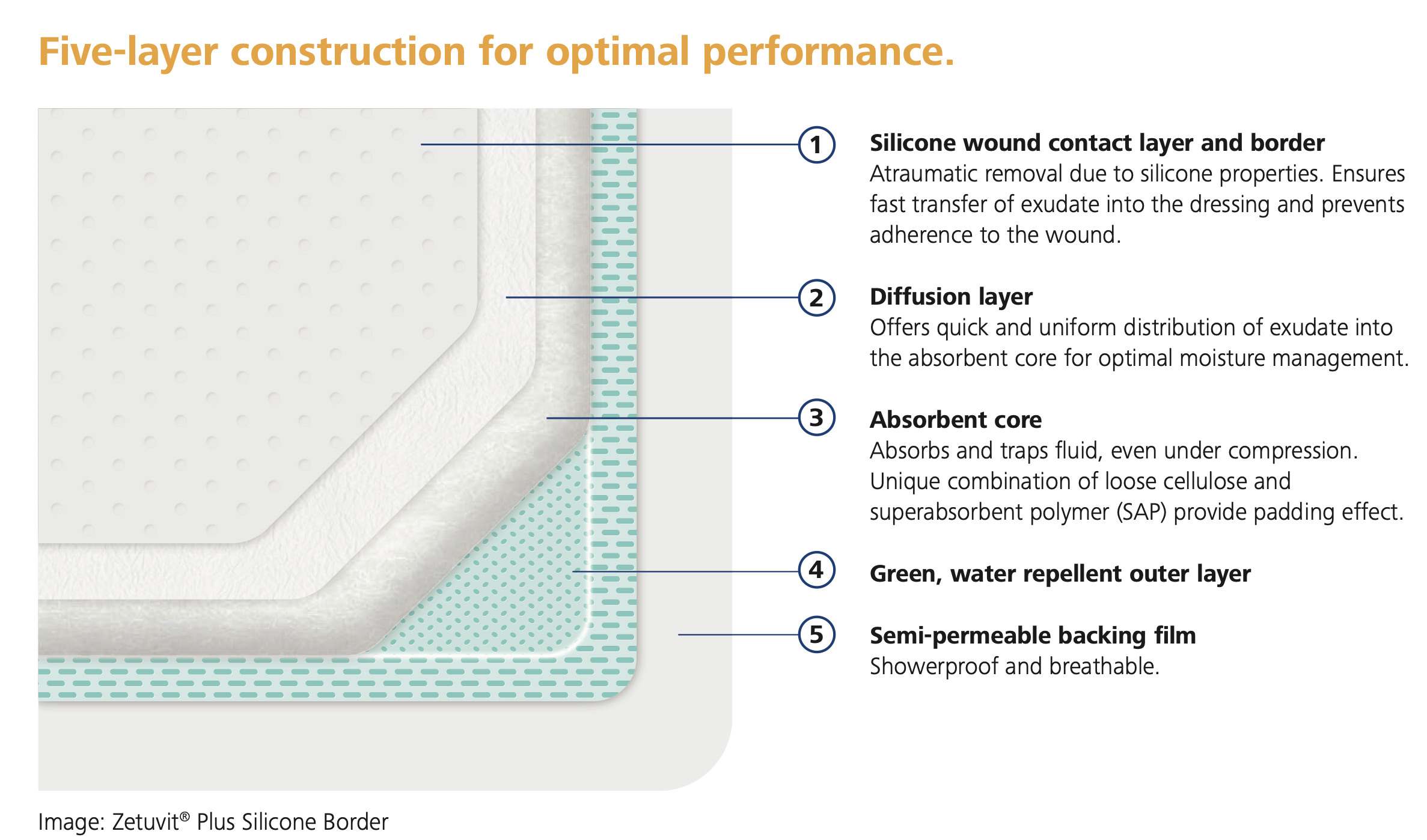 Zetuvit® Plus Silicone Border 是新一代矽膠SAP高吸收敷墊,融合超級吸收聚合物(SAP)與親膚防水自黏矽膠邊框雙重核心技術,專為中至重度滲液傷口研發(如壓瘡、足部潰瘍、燒燙傷、糖尿病足潰瘍等)。