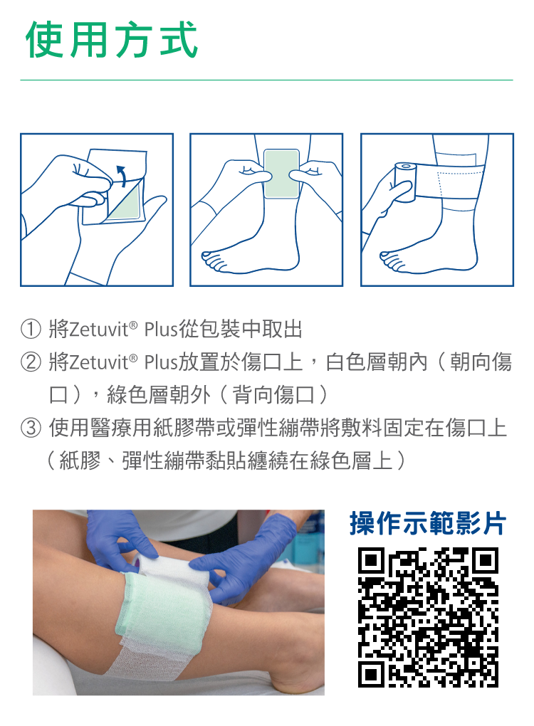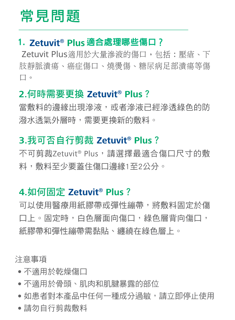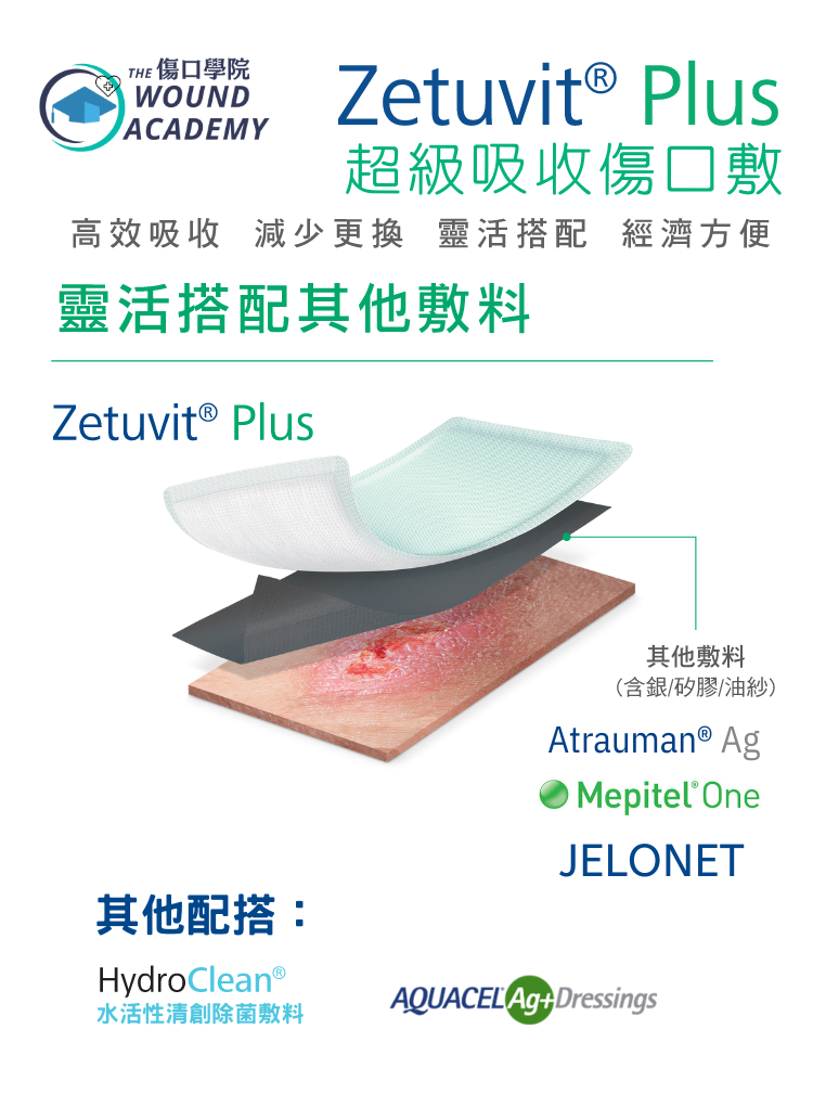 Zetuvit® Plus 特別適用於治療表面性、嚴重滲出的急性或慢性創傷,如褥瘡、下肢靜脈潰瘍,尤其適合癌症傷口。